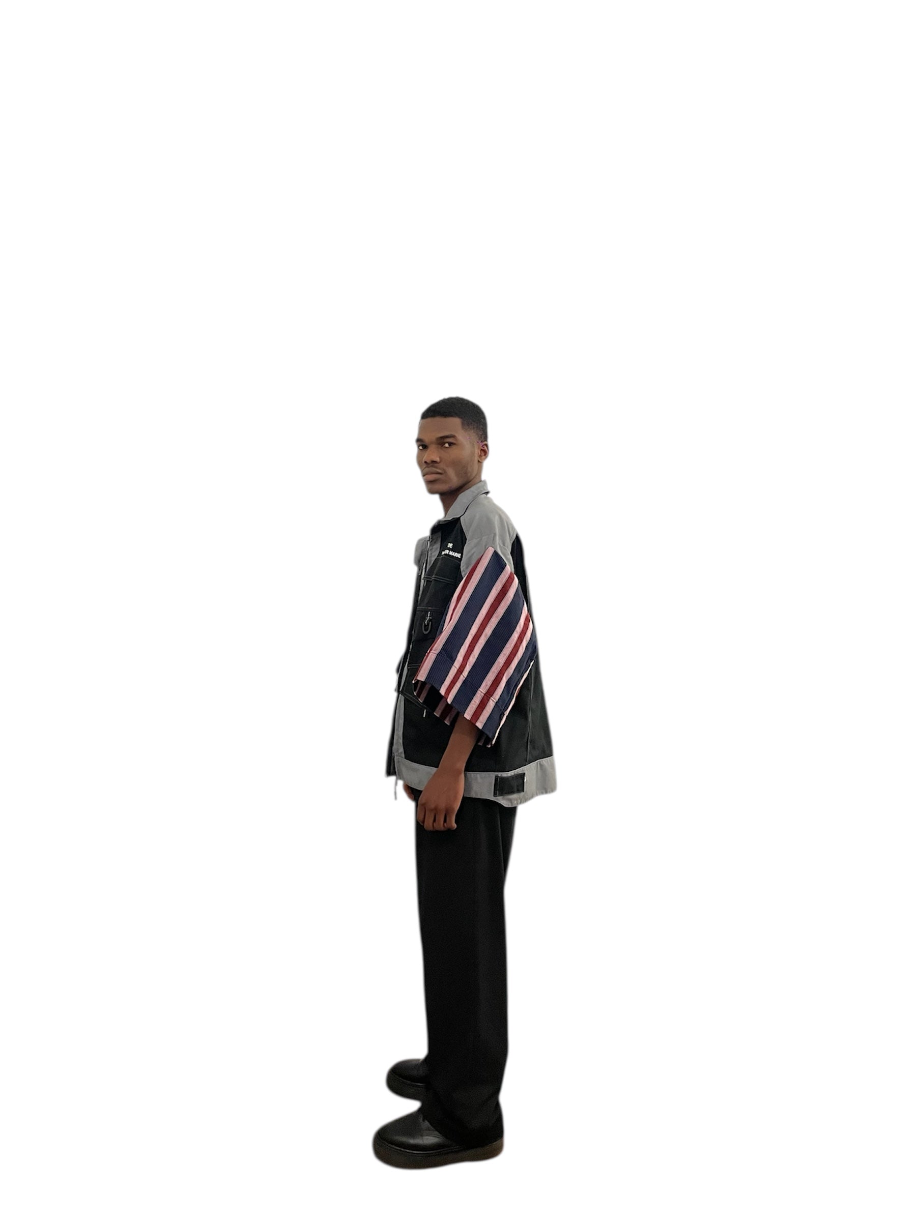 Nos pièces sont des vêtements vintage upcyclés, parfois rehaussés de touches de Kenté. Ce tissu traditionnel, tissé à Sokodé, au Togo, est composé de coton et de nylon, ajoutant une dimension unique et authentique à chaque création.